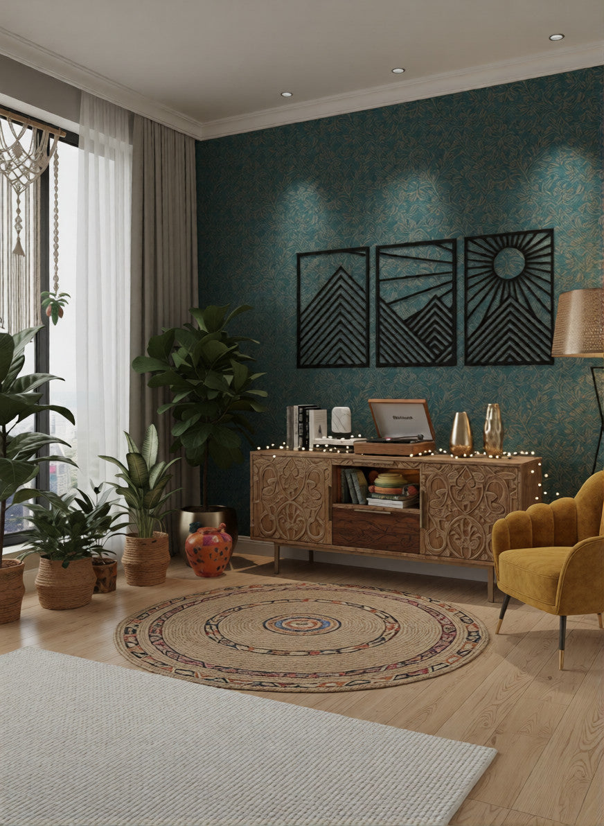 Elevate your interior with the elegant Sunrise Wallmate, crafted from premium MDF engineered wood. Featuring a modern geometric sunrise-inspired design with a refined matte lacquer finish, this three-panel statement décor piece adds timeless sophistication and contemporary charm to any living space, office, or lounge.